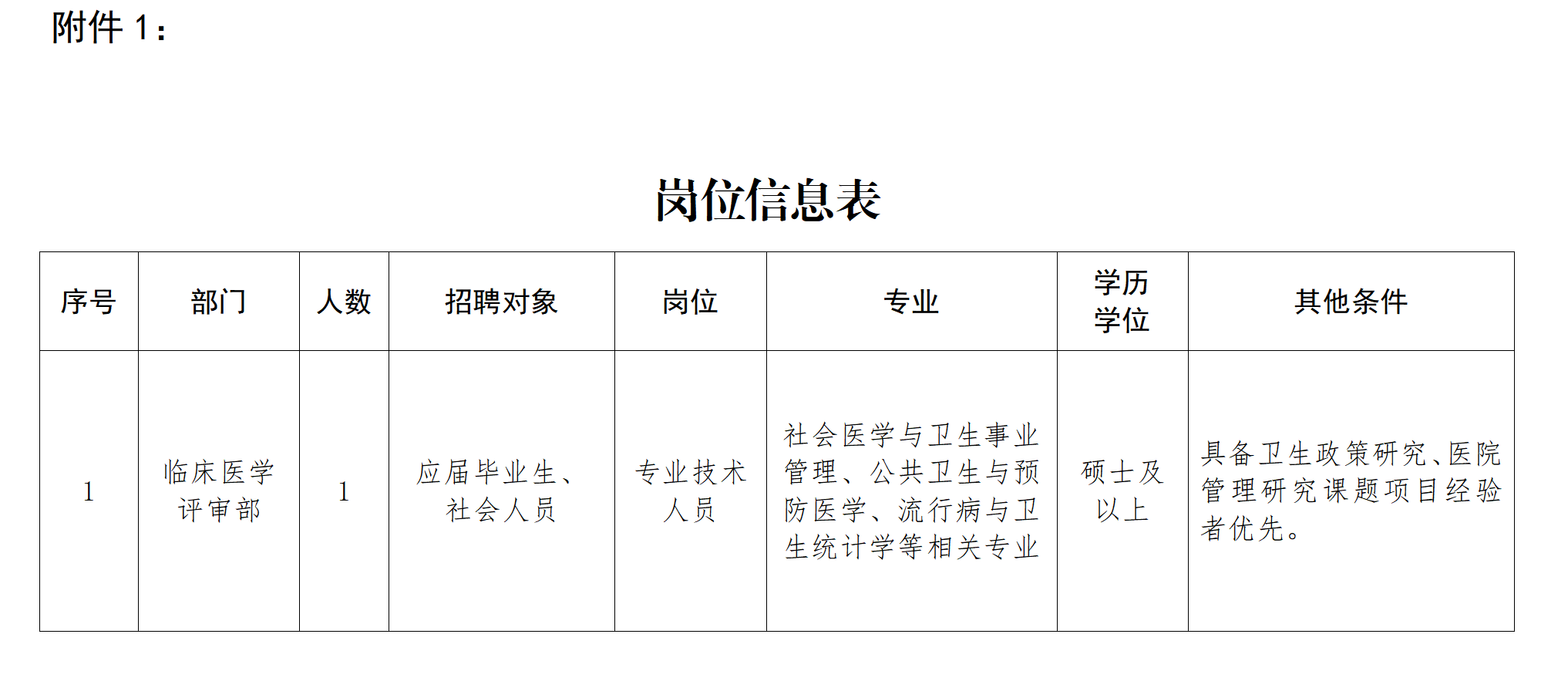 (一)招聘岗位:临床医学评审部合同制工作人员1名